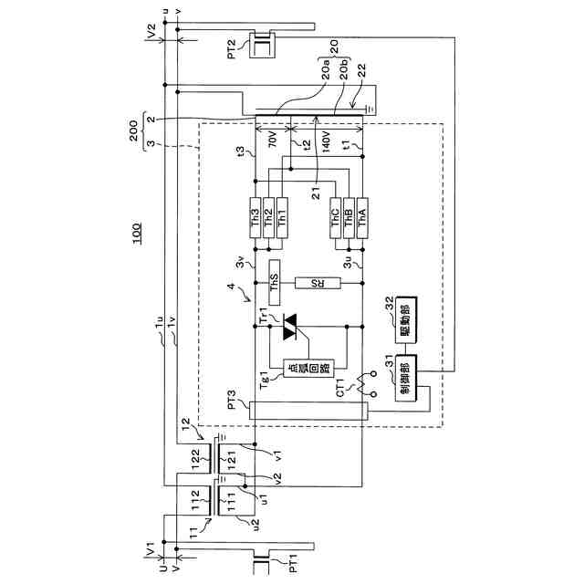 【解決手段】交流を電源から負荷に配電する配電線1u、1vに2次巻線112、122が直列に接続される直列変圧器11、12と、配電線に1次巻線が並列に接続された調整変圧器2と、調整変圧器の巻線が有するタップを切り換えて選択するための切換スイッチTh1~Th3、ThA~ThCを備え、巻線20について選択されたタップt1~t3を結線して交流を出力する負荷時タップ切換器3と、を含む電圧調整装置100であって、負荷時タップ切換器は、切換スイッチをオン又はオフしてタップを切り換える制御を行う制御部を備え、制御部は、切換スイッチを含むOLTC(onーload tap changers)回路4の回路電圧値及び2次側における2次側電圧値を取得し、取得した回路電圧値と、2次側電圧値とに基づき、切換スイッチの異常判定を行う。