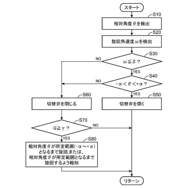 前記コントローラは、前記上部旋回体の前記下部走行体に対する相対角度が所定範囲にあるとき、前記切替弁を前記許容状態に切り替え、