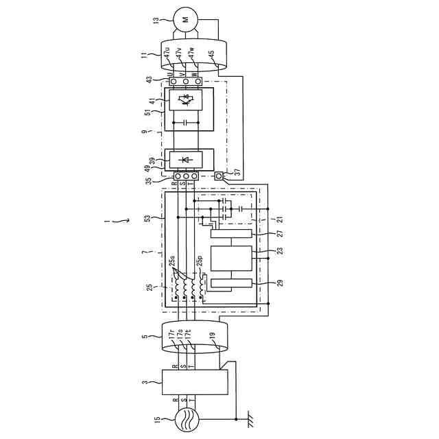 ノイズフィルタを整流部と電力変換部の間に接続する変形例に係るインバータシステムの全体構成の一例を表す図である。