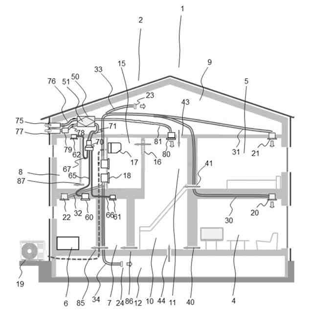 【解決手段】建物1内の浴室6と部屋Aに給気部20、21と排気部40、41を設け、排気部40、41から空調ユニット15への還気路を設け、空調ユニット15内に送風部18と空調部17とを設け、空調ユニット15にて空調部17の吹出空気の温度と部屋Aの温度との温度差より小さい温度差の空調空気を作って給気部20、21に送風し、浴室6とその他の部屋に換気給気部85と換気排気部60、61とを設け、熱交換気ユニット50により、浴室6とその他の部屋の空気と室外空気と熱交換して室外に排出し、建物1内に熱交換した後の室外空気を導入する。