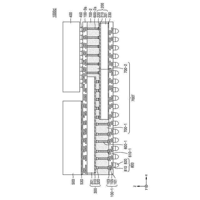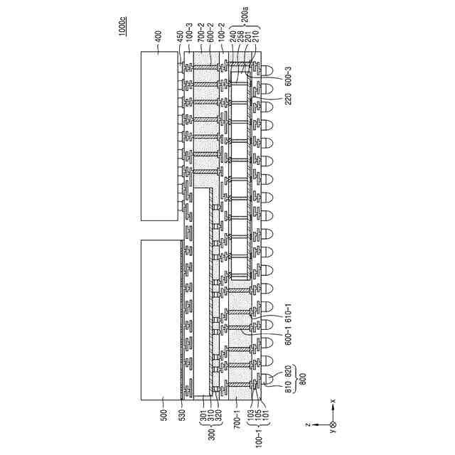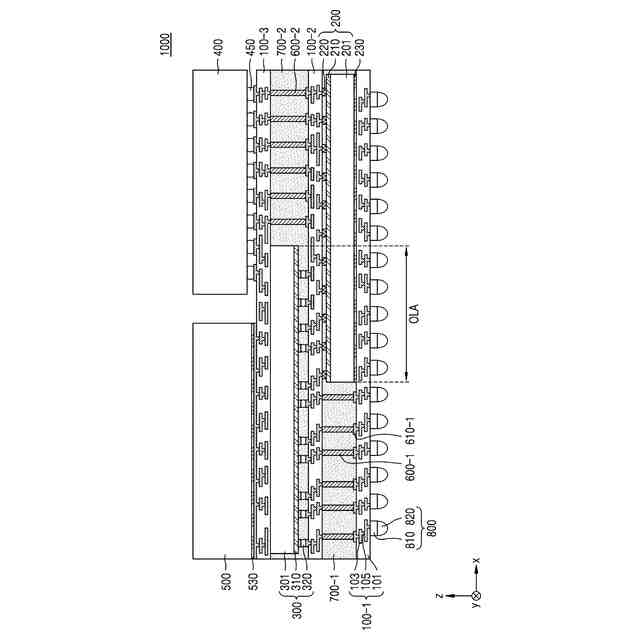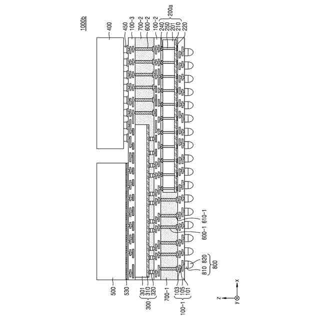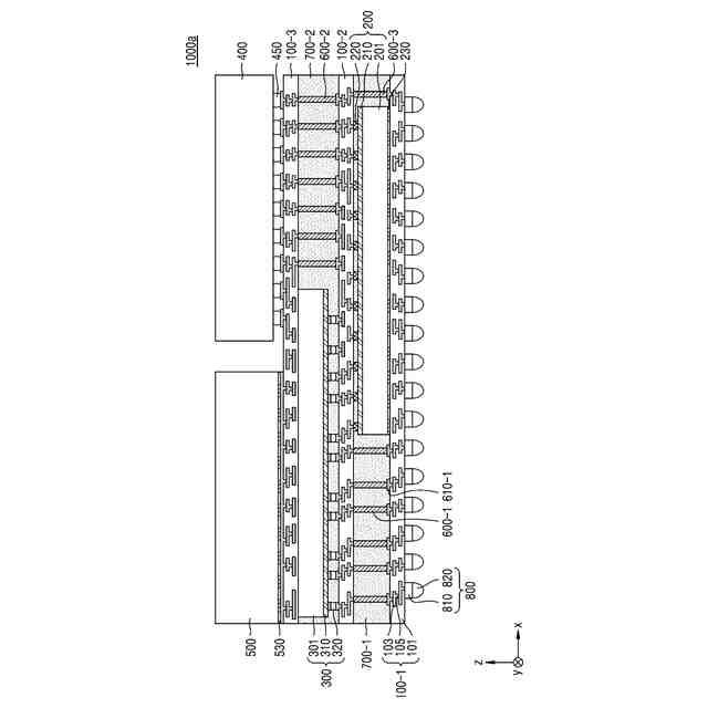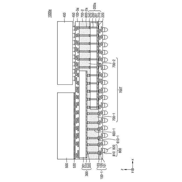form factor)の具現化、及び信頼性の向上を同時に具現化することができる。例えば、放熱ブロックが上部APチップである第2半導体チップにほぼ重畳する構造で第3再配線基板上に配置されることによって、第2半導体チップの放熱効果が向上する。また、下部APチップである第1半導体チップと、上部APチップである第2半導体チップとがz方向に重畳する構造で配置されることによって、半導体パッケージはスモールフォームファクタを具現化することができる。さらに、第1半導体チップと第2半導体チップとの連結経路が短くなることによって、SI(Signal