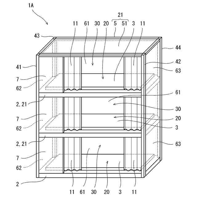 図1に、第1実施形態に係る、船舶に搭載される寝台1Aを示す。寝台1Aは、マットレスなどの寝具3を支持する支持台2と、就寝スペース30を挟んで支持台2と対向する天井壁21と、支持台2の四隅で天井壁21を支持する一対の正面側支柱41,42および一対の背面側支柱43,44を含む。
