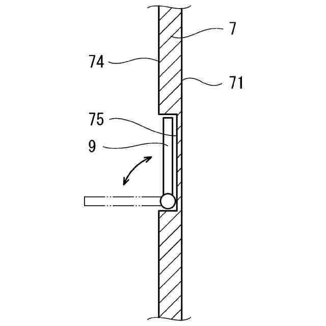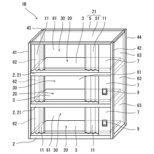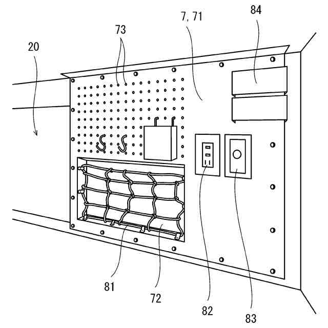 前記一対の正面側支柱の一方に隣接する位置で前記支持台と前記天井壁の間を閉塞し、前記一対の正面側支柱の他方との間に開口を形成するサイドボードと、