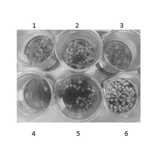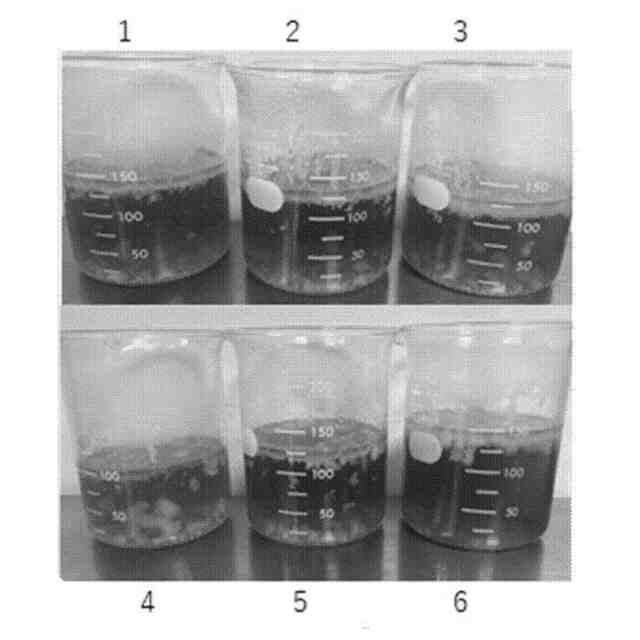 試験例2のサンプル1~6をラーメンスープに添加した状態を横から示す写真である。