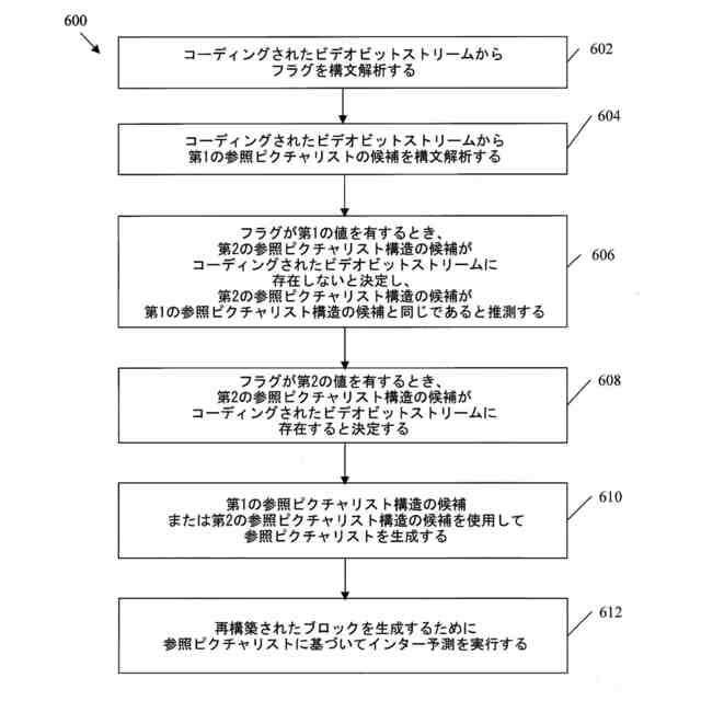 【解決手段】方法は、符号化されたストリームから第1の参照ピクチャリスト構造の候補を構文解析するステップ、フラグが第1の値を有するとき、第2の参照ピクチャリスト構造の候補がコーディングされたビデオビットストリームに存在しないと決定し、第2の参照ピクチャリスト構造の候補が第1の参照ピクチャリスト構造の候補と同じであると推測するステップ、フラグが第2の値を有するとき、第2の参照ピクチャリスト構造の候補がコーディングされたビデオビットストリームに存在すると決定するステップ、第1の参照ピクチャリスト構造の候補または第2の参照ピクチャリスト構造の候補を使用して参照ピクチャリストを生成するステップ及び再構築されたブロックを生成するために参照ピクチャリストに基づいてインター予測を実行するステップとを含む。