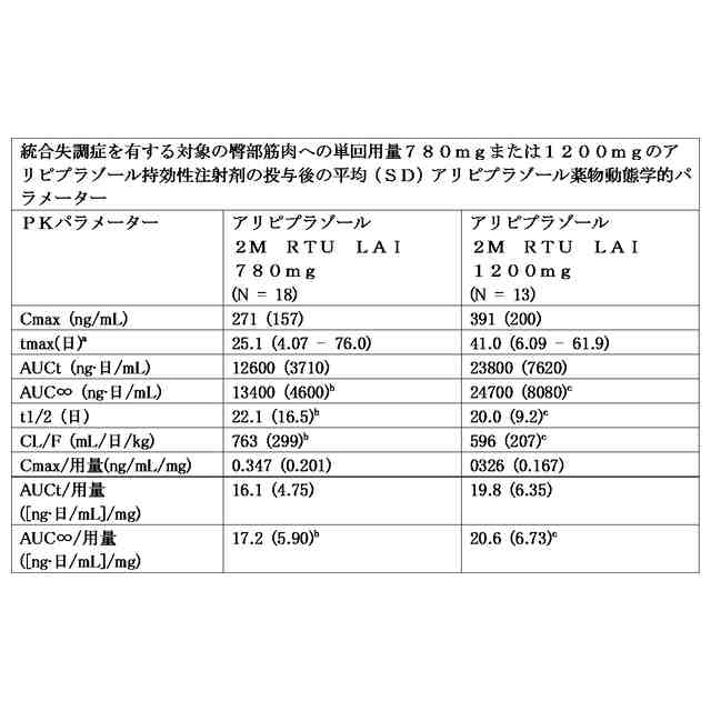毎月1回のアリピプラゾールは、経口アリピプラゾールで安定化した成人患者において、統合失調症および双極性障害I型の維持療法に適応されるアリピプラゾールの持効性IM注射製剤である。現在認可されている医薬品エビリファイメンテナ(登録商標)において、第1の用量は、経口アリピプラゾールで安定化した成人患者に、連続して14日間同時投与される経口アリピプラゾール(10mg~20mg)と共に投与される。アドヒアランスに関連した再発または最適以下の治療結果に対する潜在的な危険性があると考えられる患者集団(例えば、持効性注射剤(LAI)の患者集団)において、治療での血漿中濃度の達成は治療上の利点をもたらすことができる。