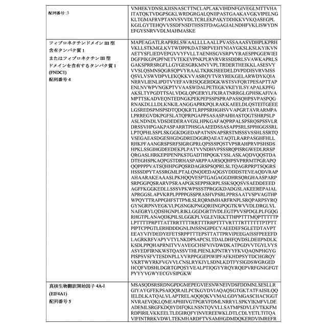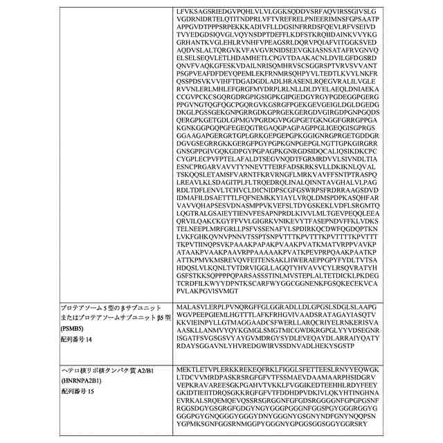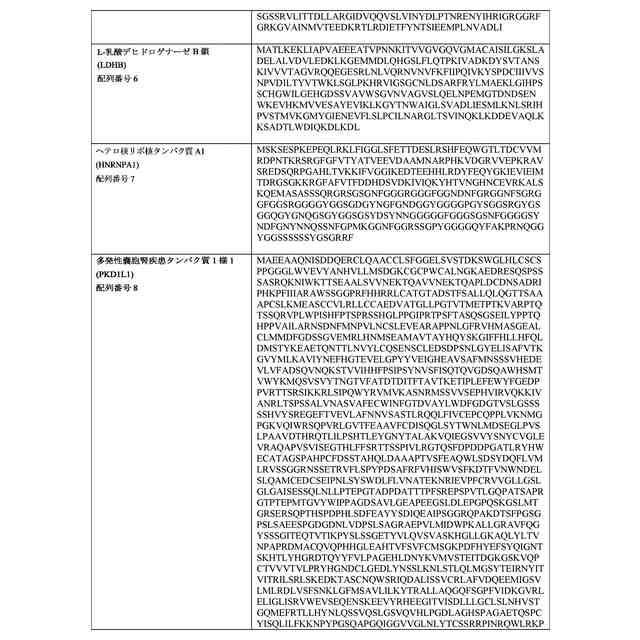 【解決手段】ファルネシルピロリン酸シンターゼ、ニューロフィブロミンI、グリセルアルデヒド-3リン酸デヒドロゲナーゼ、フィブロネクチンドメインIII型含有タンパク質1、真核生物翻訳開始因子4A-I、L-乳酸デヒドロゲナーゼB鎖、ヘテロ核リボ核タンパク質A1、多発性嚢胞腎疾患1様タンパク質1、熱ショックタンパク質コグネイト71kDa、アンキリン-3、Rho23GTPアーゼ活性化タンパク質、細胞骨格ケラチン78 II型、α-3コラーゲン鎖(VI)、プロテアソーム5型のβサブユニット、ヘテロ核リボ核タンパク質A2/B1、ヒストンH2B 1-B型、DnaJサブファミリーCメンバー13のホモログ、βエノラーゼ、グルタチオンS-トランスフェラーゼP、グルタチオンS-トランスフェラーゼMu3またはそれらの断片を検出する。