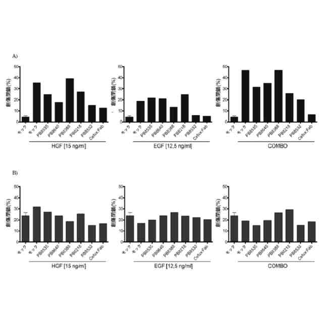 セツキシマブ及びパニツムマブは、受容体を阻害するモノクローナル抗体である。臨床開発中の他のモノクローナル抗体は、ザルツムマブ、ニモツズマブ、及びマツズマブである。モノクローナル抗体は、主に受容体へのリガンドの結合を遮断することにより、細胞外リガンド誘導受容体活性化を遮断することを目的とする。結合部位が遮断されると、シグナル誘導分子は効果的に結合できず、それにより下流のシグナル伝達を活性化することもできない。リガンド誘導受容体活性化は、不活性な受容体構造の安定化によっても阻害され得る(マツズマブ)。