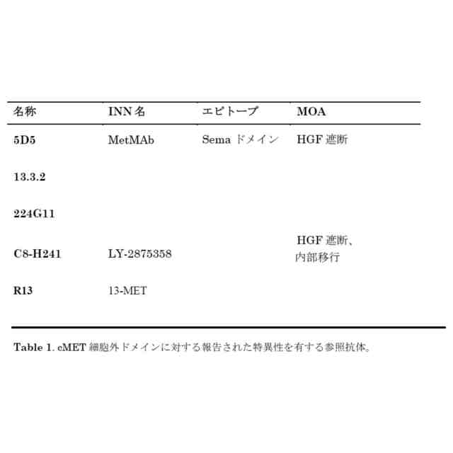 cMET受容体は、共通前駆体の、一回膜貫通のジスルフィド結合したα/βヘテロ二量体へのタンパク質プロセシングによって形成される。cMETの細胞外部分は3つのドメイン型からなる。N末端領域の折りたたみは、αサブユニット全体及びβサブユニットの一部を包含する大きなセマフォリン(Sema)ドメインを形成する。プレキシン-セマフォリン-インテグリン(PSI)ドメインはSemaドメインに続き、4つのジスルフィド結合を含む。このドメインは、免疫グロブリン様ドメインに関係する4つの免疫グロブリン-プレキシン-転写(IPT)ドメインを介して膜貫通ヘリックスに連結される。細胞内に、cMET受容体は特有の膜近傍配列及びカルボキシ末端配列に挟まれたチロシンキナーゼ触媒ドメインを含有する(その全体が参照により本明細書に組み込まれるOrgan and Tsao. Therapeutic advances in medical oncology 3.1_suppl (2011年): S7~S19)。