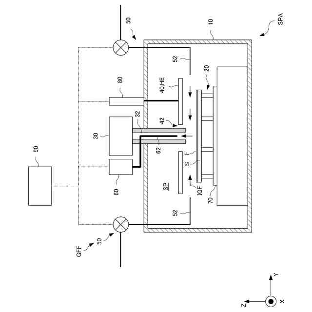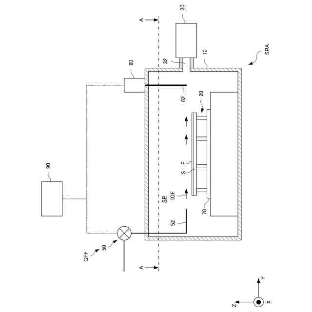 図1は、実施形態の基板処理装置SPAの構成を示す模式的な断面図である。図2は、図1におけるA-A面から下方を見た平面図である。基板処理装置SPAは、膜Fを有する基板Sの処理を行うように構成されうる。より詳しくは、基板処理装置SPAは、基板Sの膜Fを熱処理するように構成されうる。