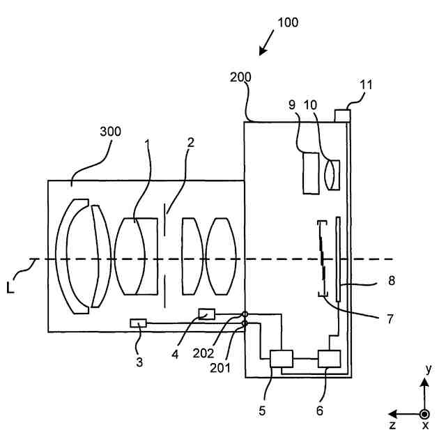 撮影レンズ本体300は、撮影レンズ系1と、絞り2と、駆動機構3と、レンズデータ部4とを備えている。撮影レンズ系1は、被写体像を所定の予定焦点面に結像させるための光学系であり、焦点調節レンズを含む複数のレンズによって構成されている。絞り2は、撮影レンズ系1を通過する光束、すなわち入射光量を制限するために、光軸Lを中心に開口径が可変な開口を形成する。駆動機構3は、電気接点201を介してカメラ本体200側から入力したデフォーカス量を用いてレンズ駆動量を算出し、レンズ駆動量に応じて撮影レンズ系1を構成する焦点調節レンズを光軸Lの方向(z軸方向)に沿って合焦位置へ駆動する。また、駆動機構3は、カメラ本体200側からの指令に応じて絞り駆動信号を出力して、絞り2の駆動を制御する。