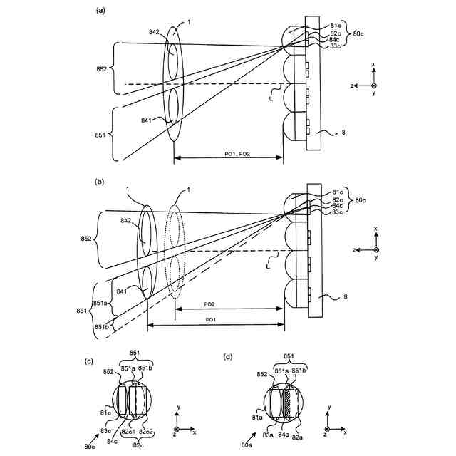 第1の態様によれば、撮像素子は、複数のマイクロレンズと、前記複数のマイクロレンズのそれぞれに対して設けられ、光学系の一対の瞳領域を通過した一対の光束を受光する一対の光電変換部と、を有し、二次元状に配列された複数の画素を備え、前記複数の画素は、前記光学系の前記一対の瞳領域のいずれか一方の瞳領域と第1マイクロレンズとを透過した光を光電変換する第1光電変換部と、前記光学系の前記一方の瞳領域と第2マイクロレンズとを透過した光を光電変換し、前記第1光電変換部と異なる受光面積を有する第2光電変換部と、前記光学系の前記一方の瞳領域と第3マイクロレンズとを透過した光を光電変換し、前記第1光電変換部と前記第2光電変換部とのそれぞれ異なる受光面積を有する第3光電変換部と、を備え、前記第1光電変換部と前記第2光電変換部と前記第3光電変換部は行方向に設けられ、前記第1光電変換部と前記第2光電変換部と前記第3光電変換部は、前記行方向において前記光学系の光軸からの距離が大きいほど受光面積が大きくなる、または、前記行方向において前記光学系の光軸からの距離が大きいほど受光面積が小さくなる、ように構成される。