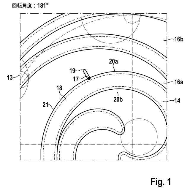 冒頭で挙げた種類の押しのけ機械は、特許文献1(独国特許出願公開第102017110913号明細書)から知られている。特許文献1には、スクロール圧縮器が記述されており、それは排出螺旋部とカウンター螺旋部とを有している。排出螺旋部がカウンター螺旋部内へ係合する。軌道周回する排出螺旋部によって、圧縮チャンバが形成され、その中で冷却剤が圧縮される。冷却剤の圧縮が可能になるようにするためには、排出螺旋部がカウンター螺旋部に密に添接しなければならない。したがって排出螺旋部がカウンター螺旋部に圧接されると、効果的である。そのために排出螺旋部の、カウンター螺旋部と逆の側に、背圧チャンバが配置されている。この種の背圧チャンバは、逆圧室(Back-Pressure-Raum)の名称でも知られている。背圧チャンバもしくは逆圧室は、圧力を構築する機能を有している。そのために排出螺旋部は開口部を有しており、その開口部が背圧チャンバもしくは逆圧室を圧縮チャンバと流体接続する。逆圧室内の圧力が排除螺旋部に、排除螺旋部をカウンター螺旋部に圧接させる力を供給するので、2つの螺旋部が互いに流体密に密閉される。