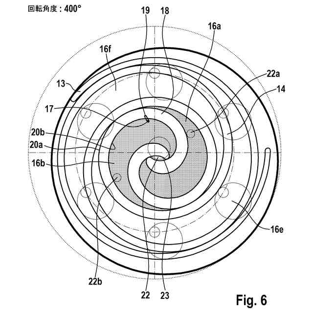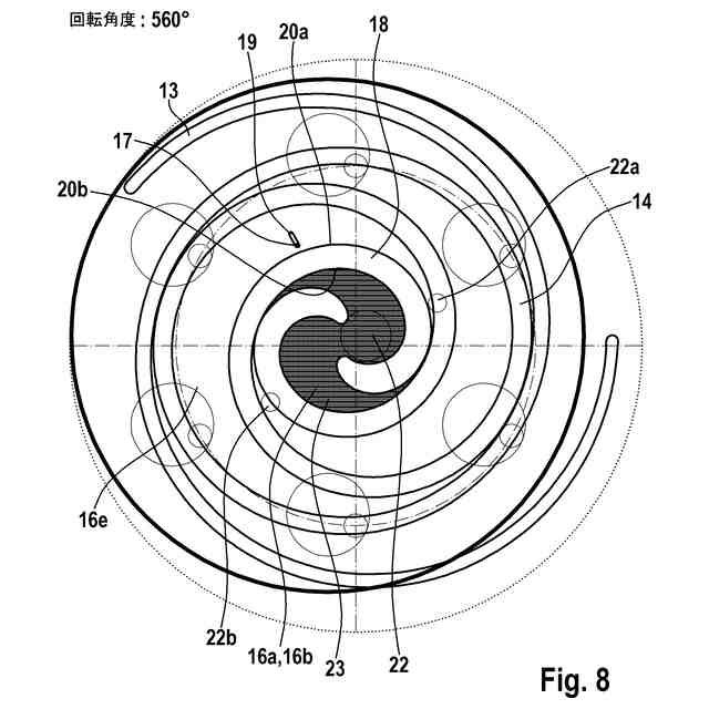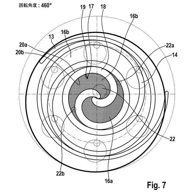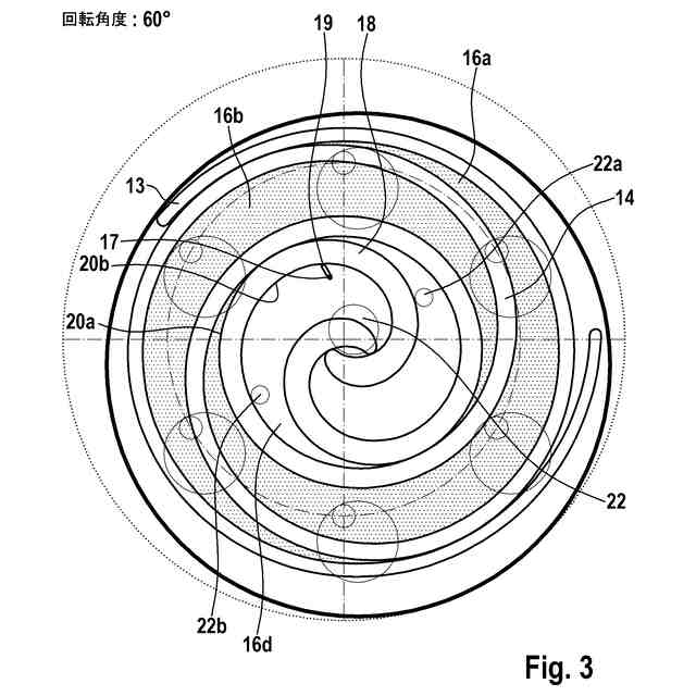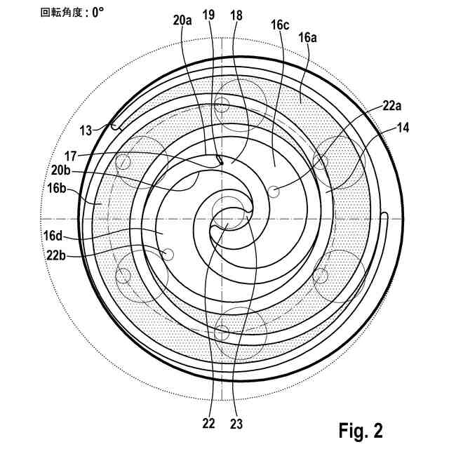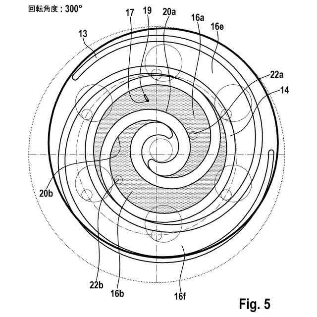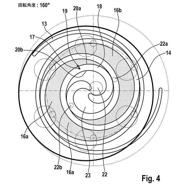 【解決手段】高圧チャンバ、低圧チャンバ、軌道周回する排出螺旋部13、カウンター螺旋部14及び背圧チャンバを有し、背圧チャンバが低圧チャンバと排出螺旋部13との間に配置されており、排出螺旋部がカウンター螺旋部14内へ、作業媒体を収容するための少なくとも1つの第1の圧縮チャンバ16aと第2の圧縮チャンバ16bが形成されるように、係合し、かつ排出螺旋部13が、背圧チャンバと流体接続するための少なくとも1つの通過開口部17を有しており、通過開口部17が排出螺旋部13内へ、排出螺旋部13の軌道周回する運動によって通過開口部17が一時的に、少なくとも部分的に第1の圧縮チャンバ16a内に、少なくとも部分的に第2の圧縮チャンバ16b内に配置されている。