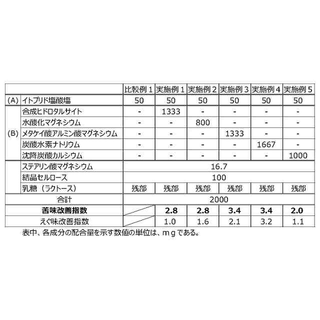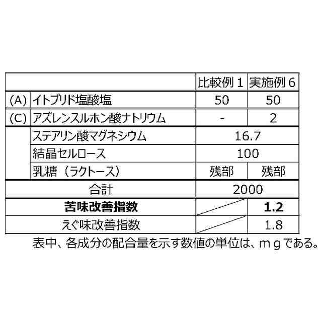 第1に、イトプリド及びその塩には、特有の苦味を呈することが知られている。このようなイトプリド及びその塩に特有の苦味は、医薬組成物において通常用いられる呈味改善のための製剤処方を採用しても改善できないほど強烈である。そのため、イトプリド及び/又はその塩の特有の苦味は、服用時にストレスを与え、ノンコンプライアンスをもたらす要因にもなっている。