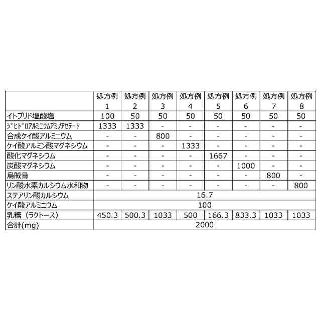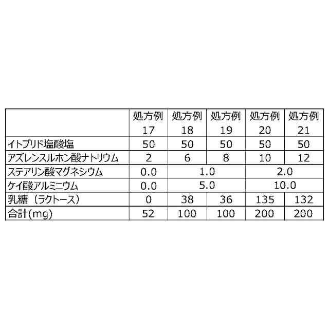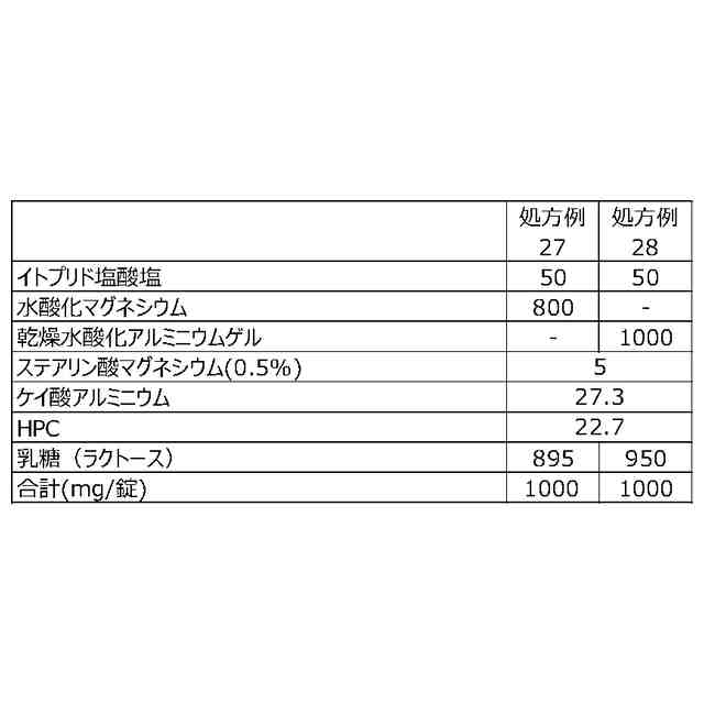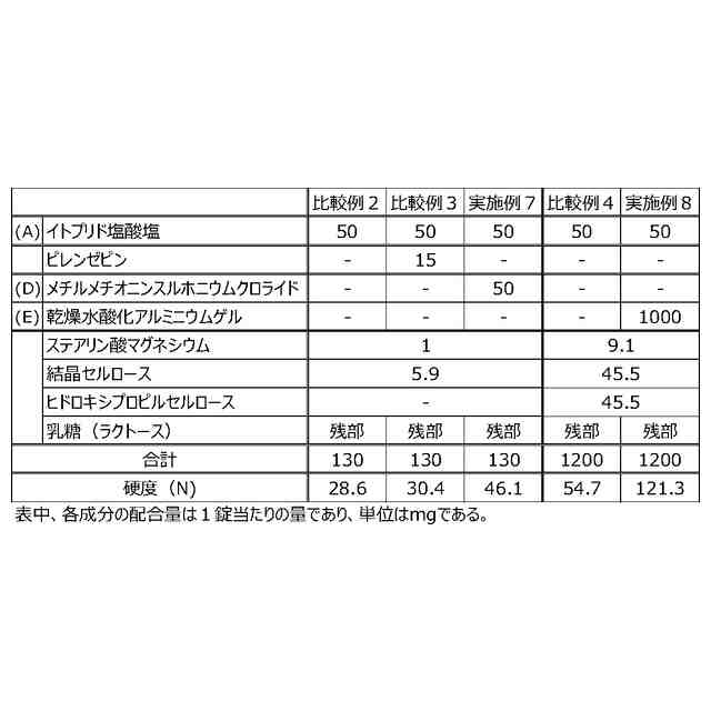 第2に、イトプリド及びその塩を含む医薬組成物の味をマスキングし服用を容易化する手段として、錠剤の形態に製剤することも考えられる。しかしながら、錠剤に成型するには、通常、硬度を付与するために所定の結合剤を必要とするが、胃腸薬においては複数の胃腸薬有効成分を配合するため、結合剤を配合する余地が少なくなる。そのため、結合剤以外の手段でイトプリド及びその塩を含む錠剤の硬度を向上できる製剤処方も望まれる。