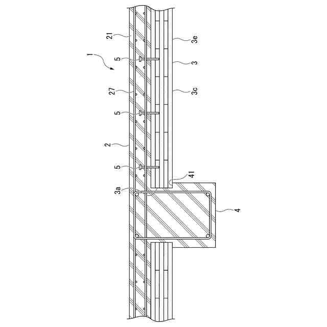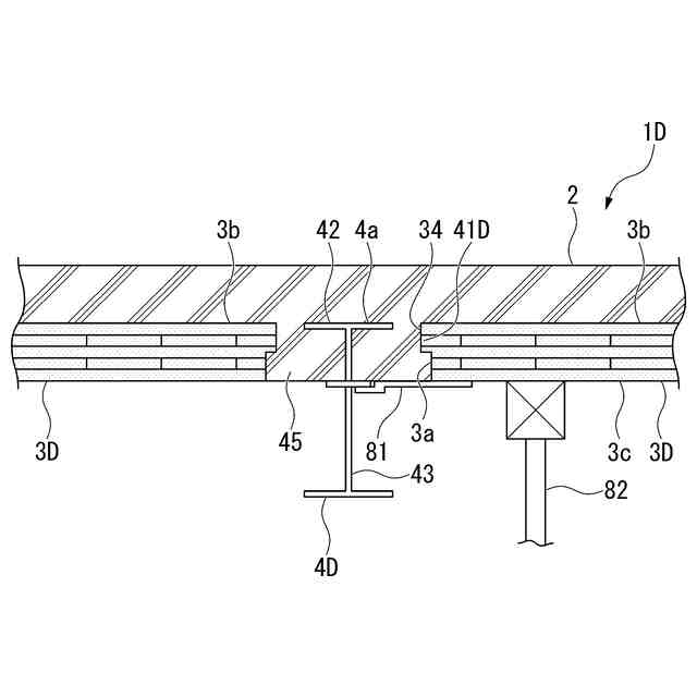 【解決手段】構造物の構造体として設けられるRCスラブ2と、非構造体であり、RCスラブの下面に沿って設けられるCLTパネル3と、を有し、RCスラブの鉄筋にトラス筋22が用いられ、CLTパネルとRCスラブとの間に設けられたシアキー5Bをさらに有し、シアキーは、鋼材でU字形状に形成され、RCスラブのトラス筋のためのスペーサを兼ねる。