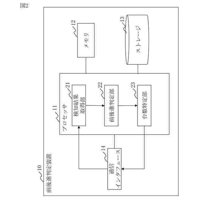 前後進判定装置10は、プロセッサ11と、メモリ12と、ストレージ13と、通信インタフェース14とのハードウェアを備える。プロセッサ11は、信号線を介して他のハードウェアと接続され、これら他のハードウェアを制御する。
