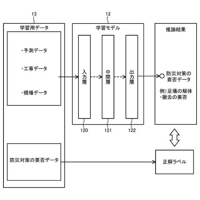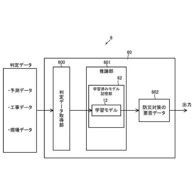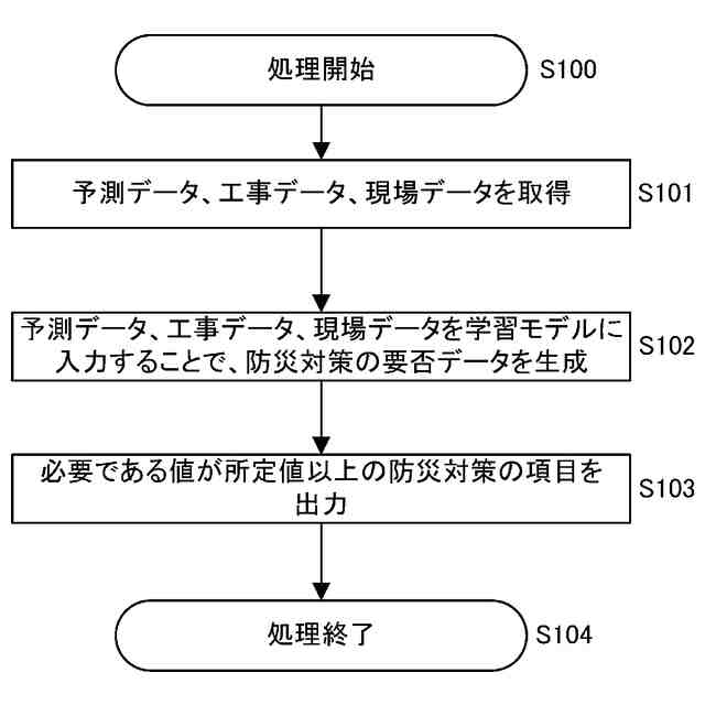 予測データと、事業所で行われる業務に関する業務データとを含む入力データと、防災対策の要否データを含む出力データとの相関関係を機械学習させた学習モデルを記憶する学習済みモデル記憶部と、