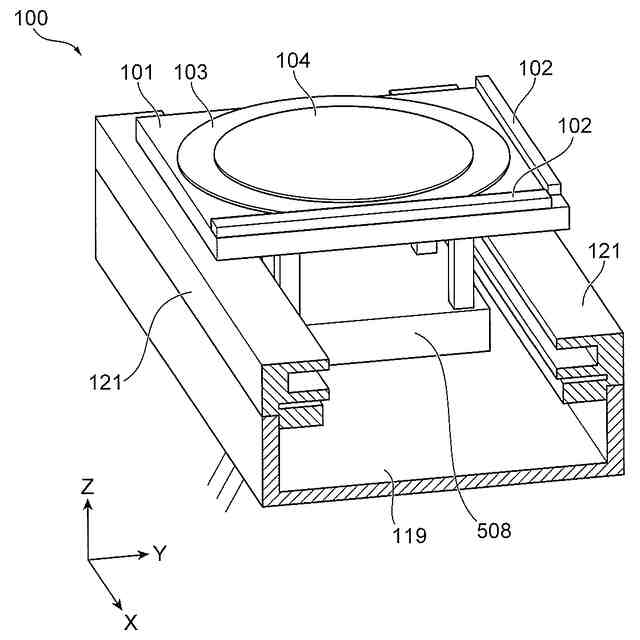 図1は、従来式の転がり案内を用いたステージの構成を示す図である。図1は、転がり案内を用いたX軸方向に可動する単軸ステージの構成例である。このステージ構成では、ベース119の上をトップテーブル101がXガイド120により案内されてX軸方向に可動する。トップテーブル101上に設置された試料台103上に位置決めを行う対象物である試料104が搭載される。このステージ構成では、接触式の転がり案内を用いているため、フラットケーブルなどの配線130の曲げ反力は、ガイド剛性により支持される。