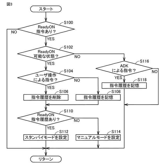 【解決手段】VCIBは、ReadyON指令があると判定され(S100にてYES)、ReadyONが可能な状態であって(S102にてYES)、ユーザ操作による指令である場合に(S106にてYES)、指令履歴を削除するステップ(S106)と、ReadyONの指令履歴がないと(S110にてNO)、マニュアルモードを設定するステップ(S114)と、ユーザ操作による指令でない場合(S104にてNO)、指令履歴を記憶するステップ(S108)と、ReadyON指令履歴があると(S110にてYES)、スタンバイモードを設定するステップ(S112)とを含む、処理を実行する。