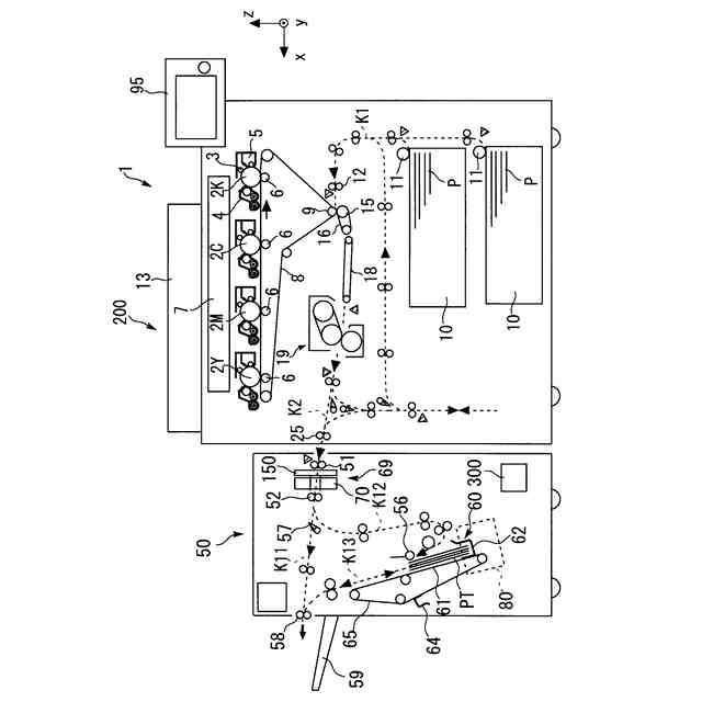 また、画像形成装置1は、コピー機能とプリンタ機能とスキャナ機能とを備えた複合機である。画像形成装置1には、ネットワークを介して遠隔入力装置としてのパソコンが接続されている。そして、ユーザーは、パソコンを用いて画像形成装置1に対して通信によって種々の指令をおこなって所望の印刷(画像形成動作)をおこなったり、操作表示パネル95の画面上に表示される操作ボタンや操作キーを手動操作して種々の指令をおこなって所望の印刷(画像形成動作)をおこなったりすることになる。
