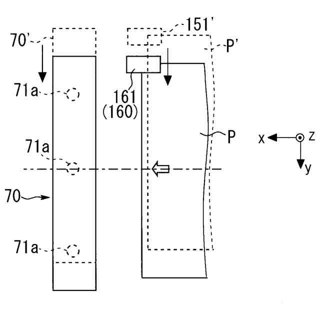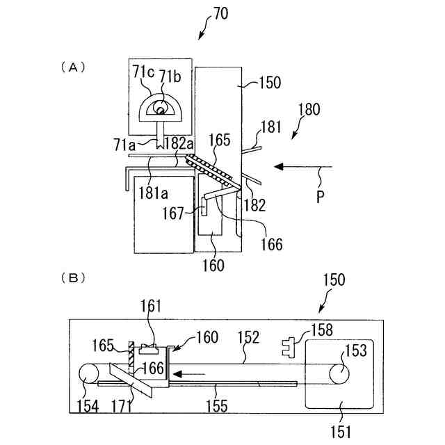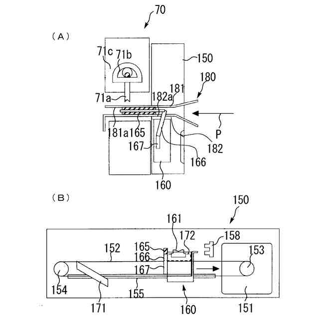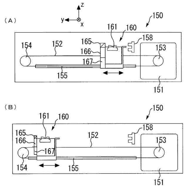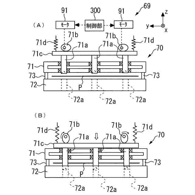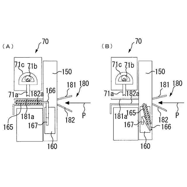 (A)センサユニットが幅方向一端側の退避位置に位置した状態の位置ズレ検知機構を示す正面図と、(B)センサユニットが幅方向他端側に位置した状態の位置ズレ検知機構を示す正面図と、である。