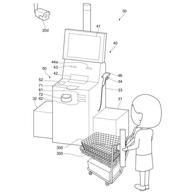 出入口5から店舗S内へ入店した顧客は、商品棚2間に形成された通路を通りながら、商品棚2に陳列された商品を選択して買い物かご300(後述する図3参照)に入れる。そして、顧客は、会計エリア3に設けられた会計装置30を用いて、買い物かご300に入れた商品の精算処理を行う。