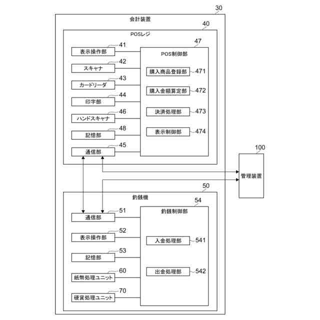 監視システム1は、店舗側端末10と、撮影装置20と、会計装置30と、管理装置100とを備えている。店舗側端末10と、撮影装置20と、会計装置30と、管理装置100とは、ネットワーク90を介して接続されている。