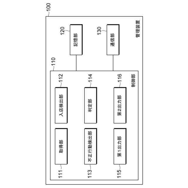 また、店舗に入店する顧客を検出するための第2の検出部と、予め定められた種別の不正行動の履歴を有する顧客が前記第2の検出部により検出された場合に、顧客が検出されたタイミングで、前記店舗側端末に、当該履歴を有する顧客が検出されたことを示す第2のアラートを出力する第2の出力部とをさらに備えることを特徴としてもよい。