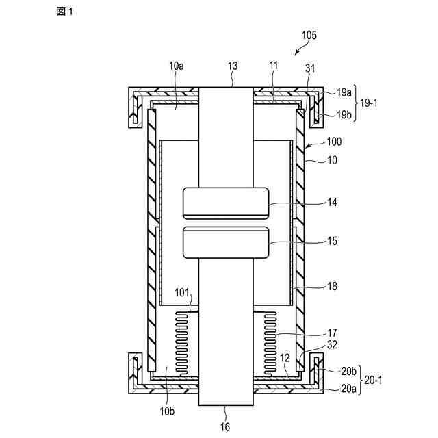 図示するように、真空バルブ105は、両端に開口10a、10bを有し、例えばアルミナ磁器等よりなる絶縁容器としての筒状のセラミックス容器10と、一方の開口10aと接合部31を介して接合された固定側封着金具11と、他方の開口10bと接合部32を介して接合された可動側封着金具12とを備えた真空容器100を含み、真空容器100内は真空が維持されている。固定側封着金具11には中央開口部が設けられ、固定側通電軸13が貫通固定されている。固定側通電軸13のセラミックス容器10内の端部に固定側接点14が固着されている。固定側接点14に対向し、切離自在の一対の接点となる可動側接点15は、可動側封着金具12に設けられた中央開口部を移動自在に貫通する可動側通電軸16の端部に固着されている。この可動側通電軸16では、中央部分より可動側封着金具12側の部分がセラミックス容器10の外に導出される部分となっており、その部分に、気密封止のための伸縮自在の筒状のベローズ17が配設されている。ベローズ17の自由端101は可動側通電軸16の中央部分に封着され、固定端102は可動側封着金具12の中央開口部に封着されている。固定側接点14と可動側通電軸16の周囲には、筒状のアークシールド18が設けられている。アークシールドは導電体であり、例えばステンレス鋼等の金属材料により形成することができる。