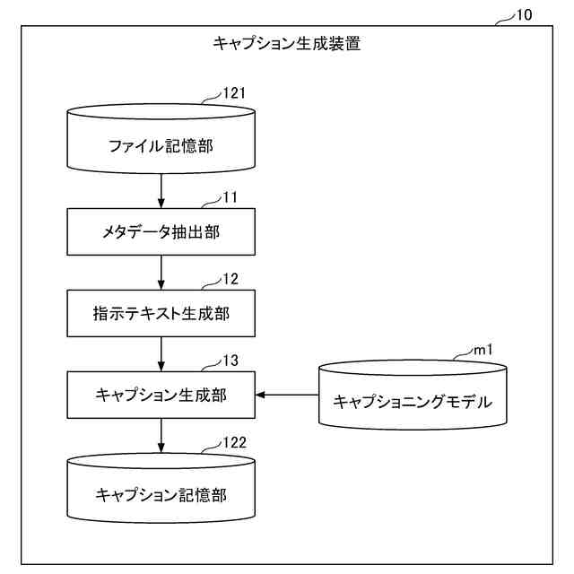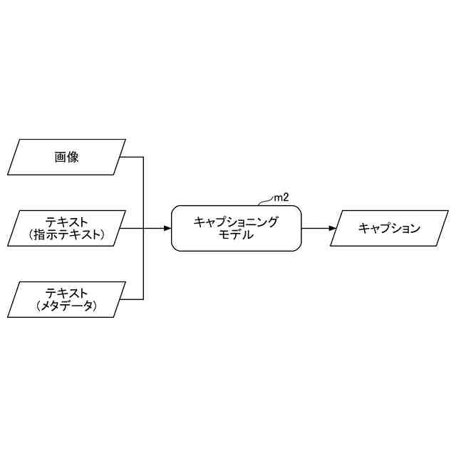 テキスト及び画像と、当該テキスト及び当該画像に関して正解としてのキャプションとの対応関係を学習済みの機械学習モデルを用いて、前記第1のメタデータに基づくテキストと前記第1の画像とに対応するキャプションを生成するキャプション生成部と、