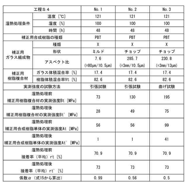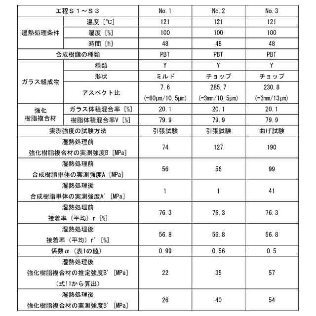 本発明者等は鋭意研究の結果、(a)湿熱処理後の合成樹脂の寄与強度は、強化樹脂複合材における合成樹脂の混合率に大きな影響を受け、(b)湿熱処理後のガラス組成物の寄与強度は、湿熱処理前後のガラス組成物に対する合成樹脂の接着率(接着率の変化率)に大きな影響を受けることを知見するに至った。具体的には、(c)湿熱処理後の合成樹脂の寄与強度は、湿熱処理後の合成樹脂単体の強度と、強化樹脂複合材における合成樹脂の混合率とに基づいて算出でき、(d)湿熱処理後のガラス組成物の寄与強度は、湿熱処理前のガラス組成物の寄与強度と、湿熱処理前後のそれぞれにおけるガラス組成物に対する合成樹脂の接着率とに基づいて算出できることを知見するに至った。したがって、これらの知見に基づいて、湿熱処理後の合成樹脂の寄与強度と、湿熱処理後のガラス組成物の寄与強度とを算出すれば、湿熱処理後の強化樹脂複合材の強度を直接測定しなくても、湿熱処理後の強化樹脂複合材の強度を推定することができる。