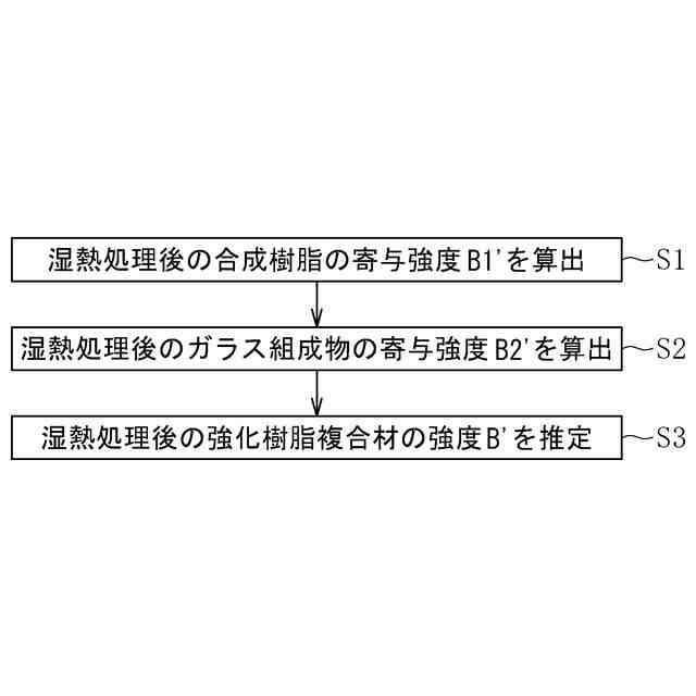 【解決手段】湿熱処理後の合成樹脂単体の強度A’と、強化樹脂複合材における合成樹脂の混合率Vとに基づいて、湿熱処理後の強化樹脂複合材における合成樹脂の寄与強度B1’を算出する工程S1と、湿熱処理前の強化樹脂複合材におけるガラス組成物の寄与強度B2と、湿熱処理前の強化樹脂複合材におけるガラス組成物に対する合成樹脂の接着率rと、湿熱処理後の強化樹脂複合材におけるガラス組成物に対する合成樹脂の接着率r’とに基づいて、湿熱処理後の強化樹脂複合材におけるガラス組成物の寄与強度B2’を算出する工程S2と、湿熱処理後の合成樹脂の寄与強度B1’と、湿熱処理後のガラス組成物の寄与強度B2’とに基づいて、湿熱処理後の強化樹脂複合材の強度B’を推定する工程S3と、を備える。