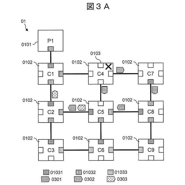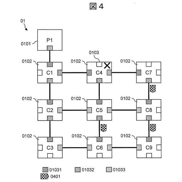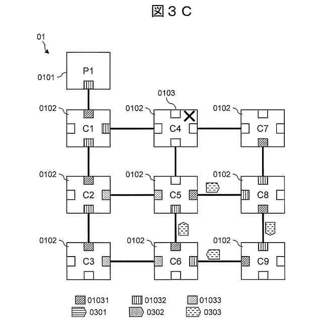 実施例1において、通信子局0102のC4が停止(メンテナンスによる意図的な停止)後の状態を示す図である。