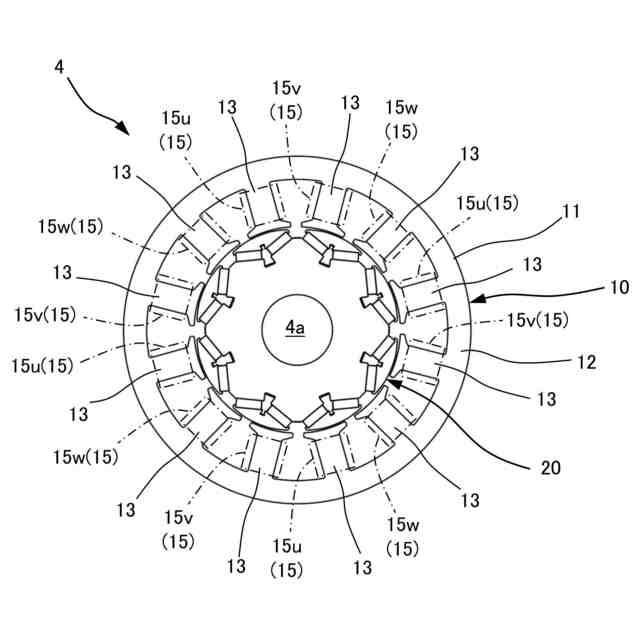 特許文献1には、径方向に延びるティースを周方向に複数有するステータコア及び前記ティースに巻回された巻線を有するステータと、複数の磁極を有するロータとを備えたモータが記載されている。特許文献1に記載されたモータは、前記巻線が前記ティースに集中巻で巻回されており、前記ロータの極数と前記ステータのスロット数(巻線数)との比が2:3となるように構成されている。