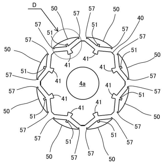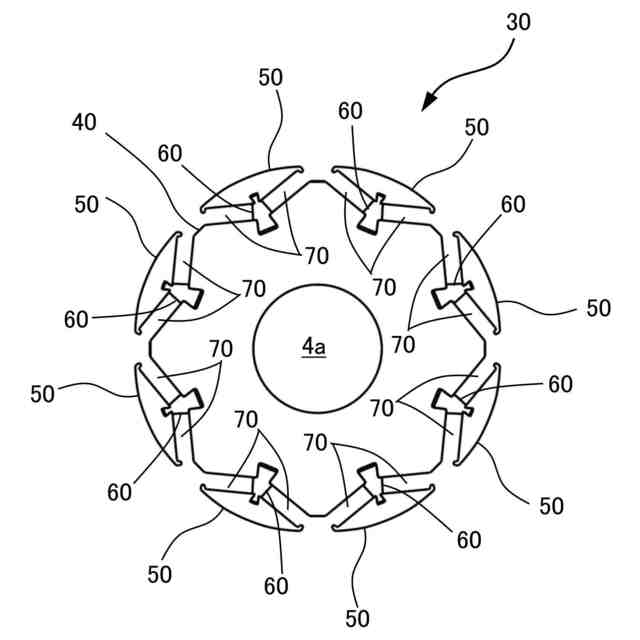 非磁性材料で形成されて前記コア本体部と前記複数のコア外側部のそれぞれとを径方向に間隔をあけて連結する複数の非磁性ブリッジ部材と、