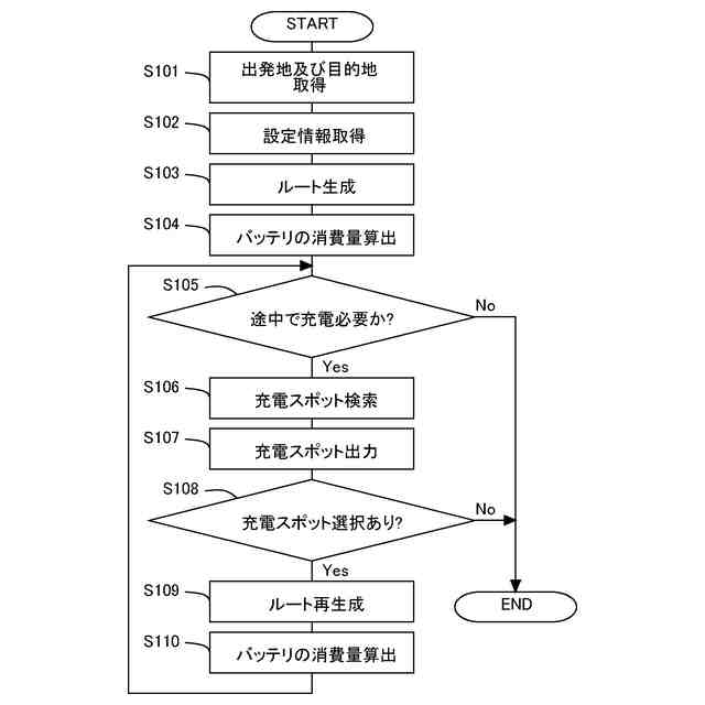 予測される前記バッテリの消費量に応じて、前記出発地から前記目的地までのルート上及び前記ルートの周囲の少なくともいずれかにおいて、1以上の充電スポットの検索を行うことと、