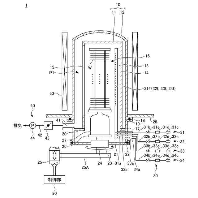 成膜装置1は、複数枚の基板Wに対して一度に処理を行うバッチ式の装置である。基板Wは、例えば半導体ウエハである。成膜装置1は、処理容器10と、ガス供給部30と、排気部40と、加熱部50と、制御部90とを備える。