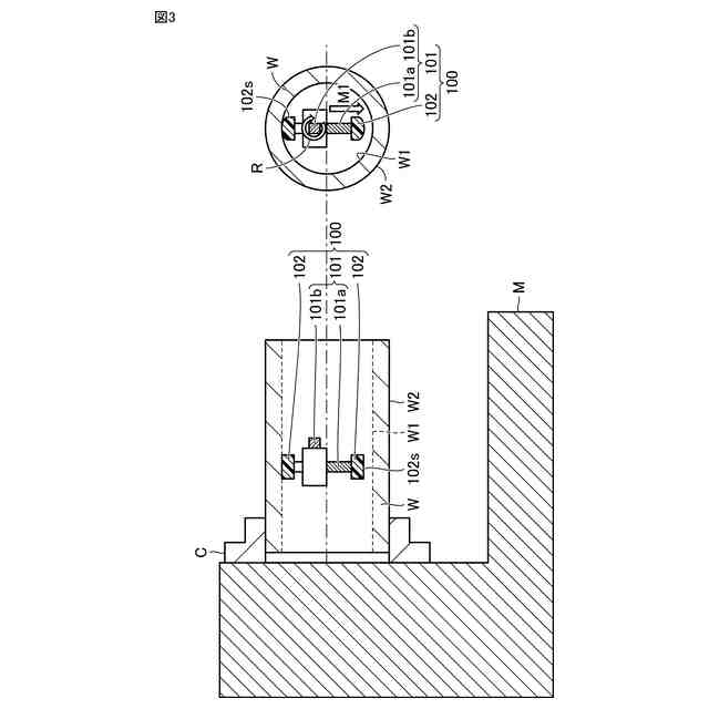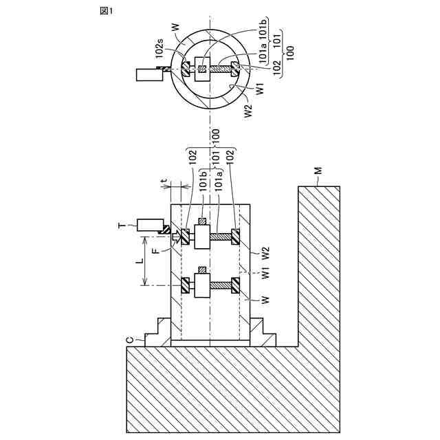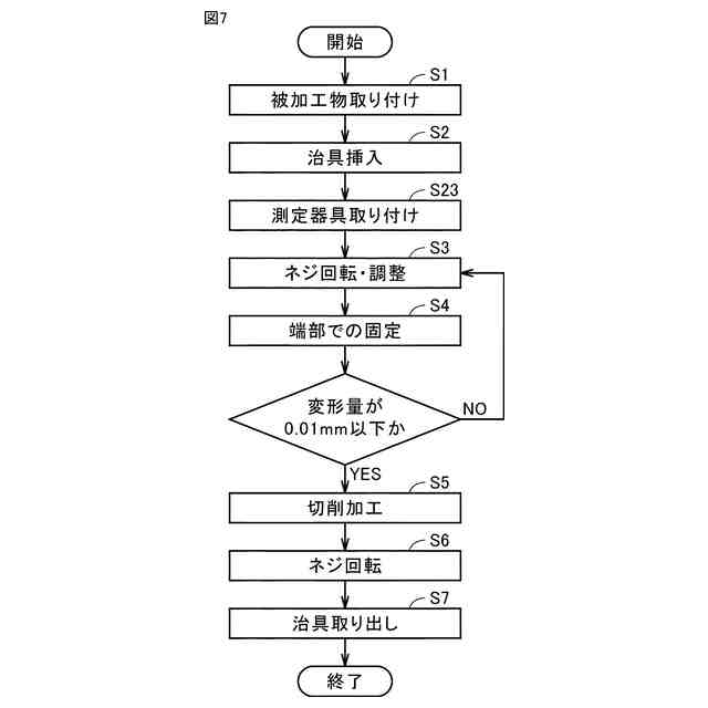 【解決手段】被加工物Wの壁面W1に、第1延在方向の長さを変更可能な治具100が取り付けられる。治具100が壁面W1に取り付けられた状態で、被加工物Wの外周面W2が除去加工される。治具100を取り付ける工程において、治具100の第1延在方向の長さを調整しながら、治具100の第1延在方向についての一方の端部が壁面W1に接し、壁面W1を押圧するように治具100が取り付けられる。