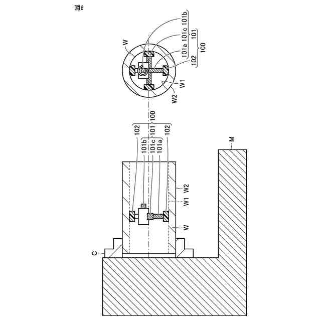 図7の測定器具取り付け工程(S23)において、被加工物に測定器具が押し当てられる態様を示す概略図である。