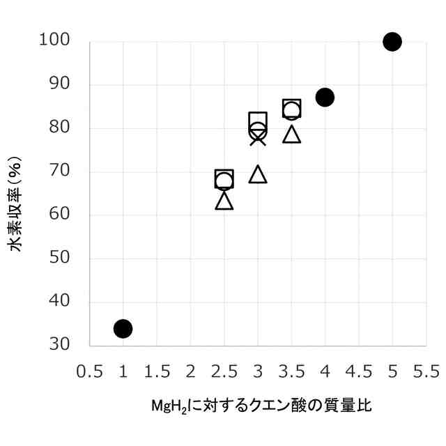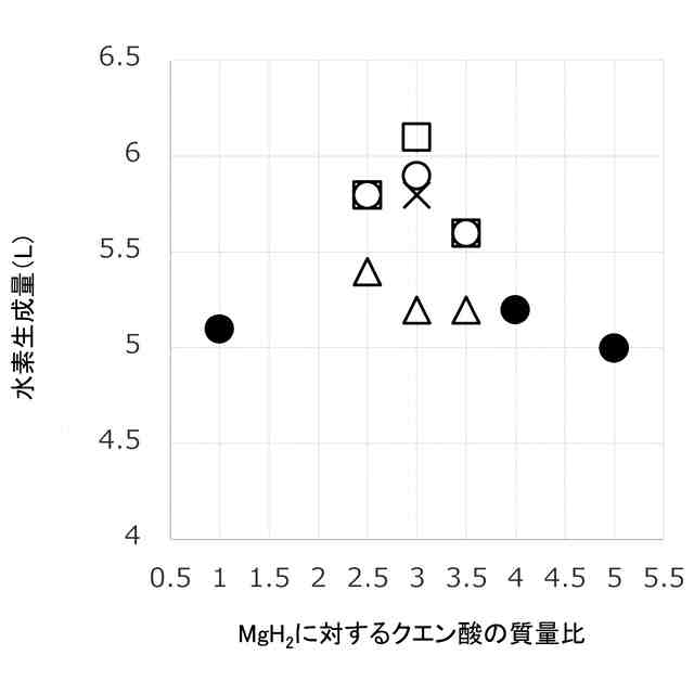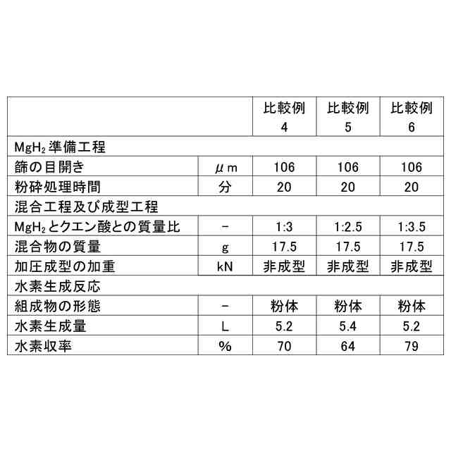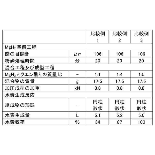 金属水素化物を加水分解して水素を生成させる従来技術の方法では、酸の添加により、金属水素化物の表面における金属水酸化物の不動態の生成を妨げて、生成する水素収率を向上し得ることが知られている(例えば、特許文献2)。他方、酸の添加量が増加して金属水酸化物の量が相対的に低下すれば、水素生成量が低下し得る。しかしながら、水素を高収率及び高生成量で生成し得る金属水素化物及び酸の最適な混合比は知られていなかった。