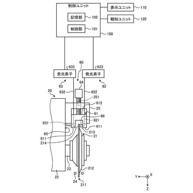 該環状の切れ刃の厚さ方向の一方側に対峙して配設された発光部と、