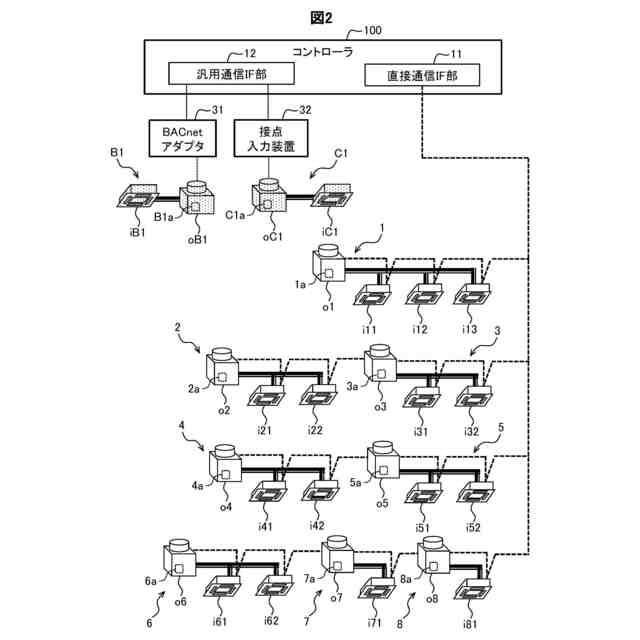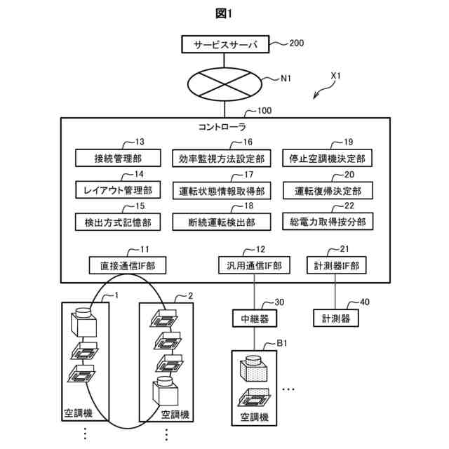 空調制御システムX1は、複数の空調機を制御するシステムである。なお、図1では簡略化して示しているが、コントローラ100の制御対象である複数の空調機は、それぞれ、室外機と、この室外機に冷媒配管を介して接続される1台又は複数台の室内機と、を備えている(図2参照)。つまり、複数の空調機のそれぞれが個別に冷媒系統を有している。このような空調機は、いわゆるマルチエアコン(VRF:Variable Refrigerant Flow)として構成されていてもよく、また、業務用エアコンや他の種類のエアコンとして構成されていてもよい。また、複数種類の空調機が混在していてもよい。複数の空調機の空調対象として、例えば、オフィスや店舗の他、商業施設や工場やプラント、保管庫といったものが挙げられる。