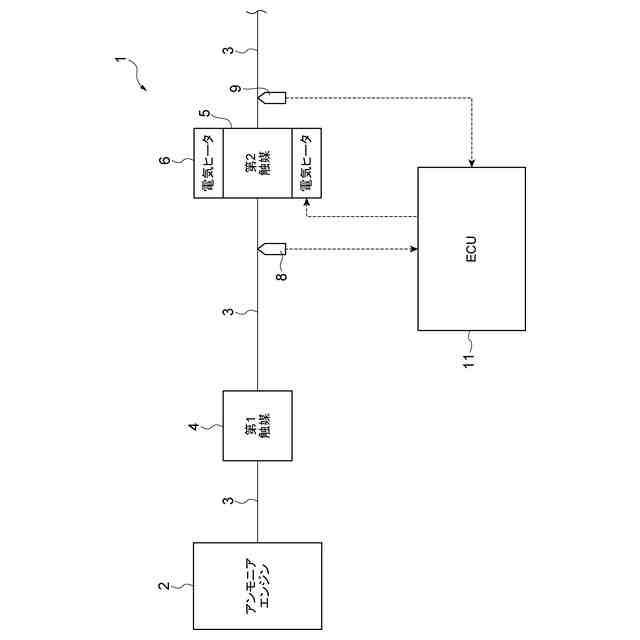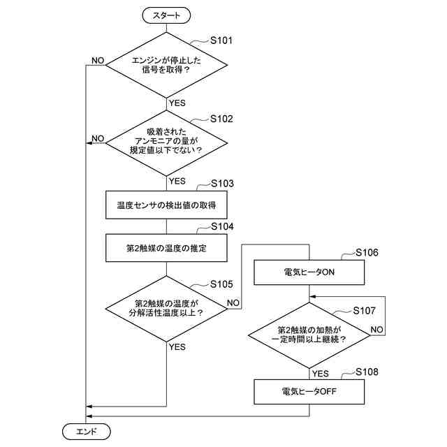 このような構成では、第2触媒の加熱が一定時間以上継続したかどうかが測定される。第2触媒の加熱が一定時間以上継続すると、第2触媒におけるアンモニアの分解が十分に進行する。更に、第2触媒の加熱が一定時間以上継続したときは、加熱器をOFFにすることにより、第2触媒に吸着されたアンモニアが十分に除去されると共に、加熱器の省電力化が図られる。