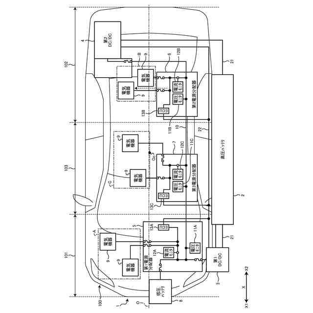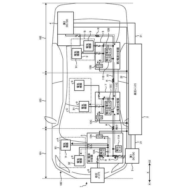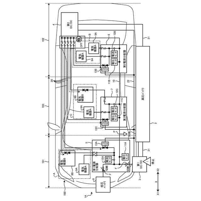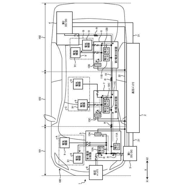 図1、図2、図3、図4に示す本実施形態に係る車両用電源システム1は、例えば、EV(Electric Vehicle)等の車両100に搭載される。車両用電源システム1は、車両100に搭載された高圧バッテリ2、第1DC/DCコンバータ3、第2DC/DCコンバータ4、第1電源分配器5、第2電源分配器6、第3電源分配器7、低圧バッテリ8、電気機器9、及び電源ライン10を含んで構成される。