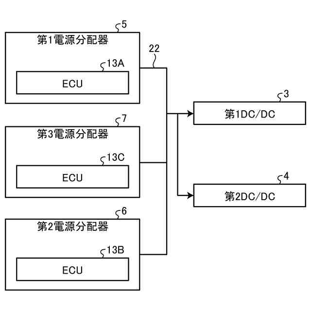 図5は、2つのDC/DCコンバータと3つの電源分配器との間の電圧情報、電流情報の流れを示すブロック図である。