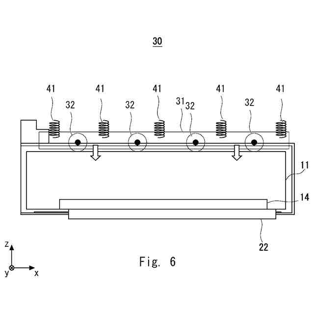 図1において、蓄電装置構造10は、着脱式電池パック11と、電池パック収容部21と、冷却板22と、冷却構造23を備える。着脱式電池パック11は、電池セル12と、熱伝導体13と、冷却板14を備える。