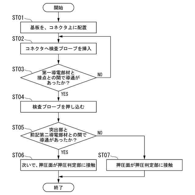 前記コネクタへの前記検査プローブの挿入時において、前記第一導電部材と前記接点とが導通したか否かを判定するステップと、