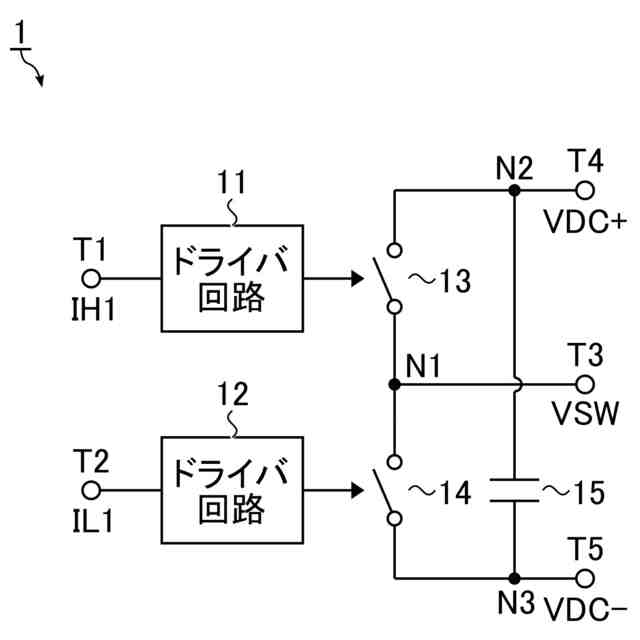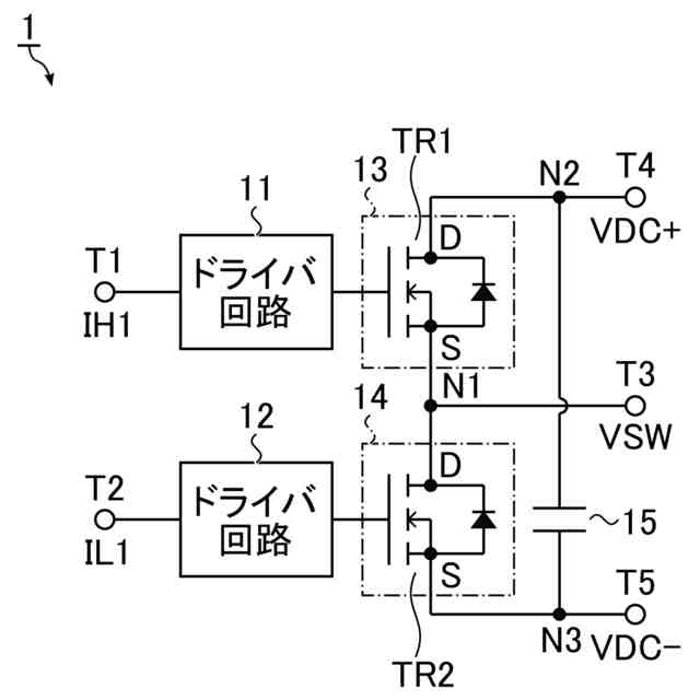 半導体装置1は、例えば、電源モジュールである。半導体装置1は、制御端子T1及びT2、ドライバ回路11及び12、入出力端子T3、T4、及びT5、スイッチング素子13及び14、並びにコンデンサ15を含む。
